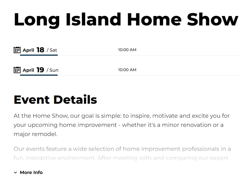 ![]() | Long Island Home Show A practical weekend outing with vendors, ideas, and demos for homeowners and casual visitors alike. |