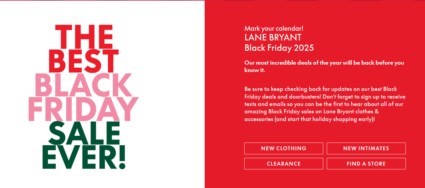 | 🛍️ Lane Bryant – The Best Black Friday Sale Ever 🟠 The countdown is on—our biggest event of the year is almost here! Deep discounts on plus-size jeans, sweaters, bras & more Sneak peek: Early access to must-have styles before they sell out Earn Lane Rewards fast—get bonus points for shopping, reviewing & more Sign up for texts (Text LBBLKF to 552255) to unlock exclusive deals Don’t miss your chance to refresh your wardrobe and save big