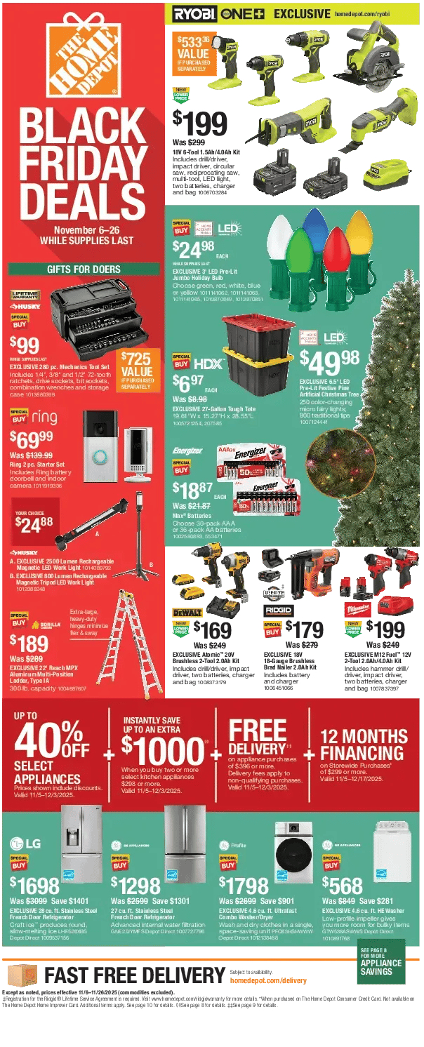 | 🧰 The Home Depot – Black Friday Tool & Appliance Deals 🔨 Big tools. Bigger savings. Black Friday Deals run Nov 6–26 Save on top brands like Ryobi, Husky, Ring & Gorilla Up to 40% off appliances + extra $1,000 off kitchen bundles Free delivery on orders $396+ and 12-month financing available