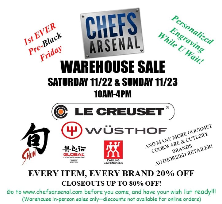 | 🍳 Chef’s Arsenal – Pre-Black Friday Warehouse Sale 🔥 Gourmet gear. Unbeatable deals. One weekend only. 🗓️ November 22–23, 2025 | 10 AM–4 PM Every item, every brand 20% off – no exclusions Closeouts up to 80% off on cookware, knives & accessories Featuring Le Creuset, Wüsthof, Shun, Global, Zwilling & more Personalized engraving available while you wait! 📍 999 South Oyster Bay Rd, Suite 110A, Bethpage, NY
