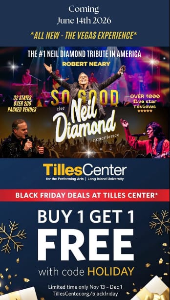 | 🛍️ Tilles Center – Black Friday BOGO Deal on Neil Diamond Tribute 🎤 Buy 1 Ticket, Get 1 FREE – Feel the Diamond Magic! The #1 Neil Diamond Tribute in America: So Good – The Neil Diamond Experience starring Robert Neary Coming June 14, 2026 – All New Vegas Experience! Use code HOLIDAY at checkout Limited-time offer: Nov 13 – Dec 1 Tickets available at TillesCenter.org/blackfriday