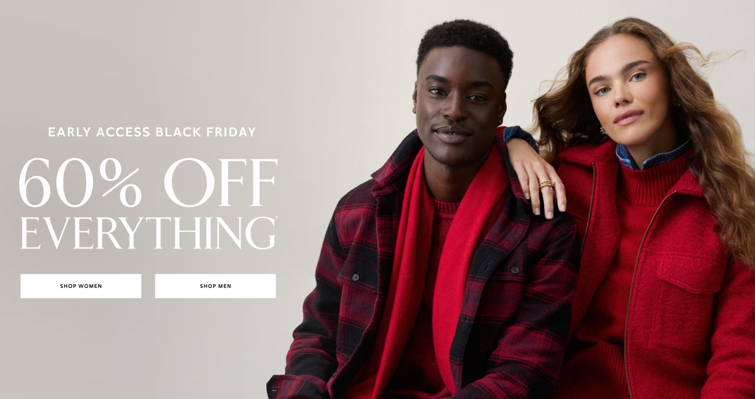 | 🛍️ Banana Republic Factory – Early Access Black Friday Event 🔴 Chic deals. Classic savings. Get 60% off everything sitewide Plus an extra 20% off—no code needed Shop online only, limited time Style up for the season with timeless men’s and women’s fashion