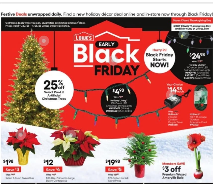 | 🎄 Lowe’s – Early Black Friday Holiday Deals 🧰 Decorate more. Spend less. Black Friday Deals available Nov 20–26 🎄 25% off select pre-lit artificial Christmas trees 💡 LED string lights starting at $4.98 🪴 Festive plants & poinsettias from $1.98 🎁 Outdoor extension cords & timers – $14.98 each