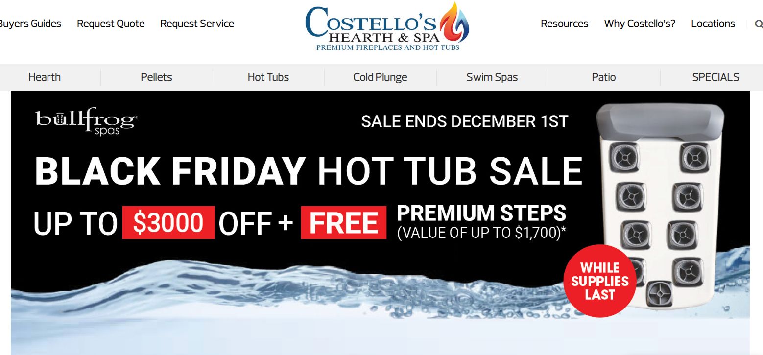 | 🛍️ Costello’s Hearth & Spa – Black Friday Hot Tub Sale 💦 Soak up serious savings! Up to $3,000 OFF select Bullfrog Spas FREE Premium Steps (valued up to $1,700) Save up to $15,000 off MSRP or finance at 0% APR for 48 months Featuring Bullfrog Spas A Series™ with JetPaks® for custom massages Perfect way to relax and warm up this winter