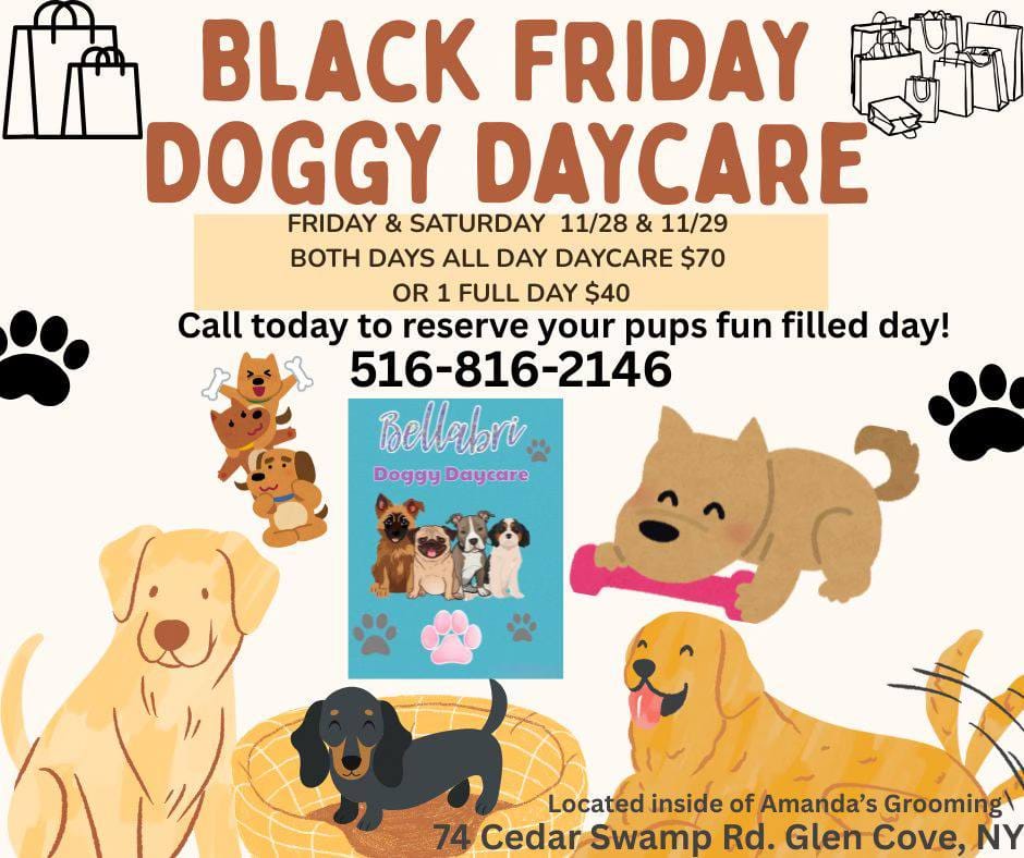 | 🐾 Bellabrì Doggy Daycare – Black Friday Doggy Daycare Deal 🎉 Treat your pup to a fun-filled stay! Special Black Friday offer on Nov 28 & 29 $70 for 2 full days of daycare or $40 for 1 day Located inside Amanda’s Grooming