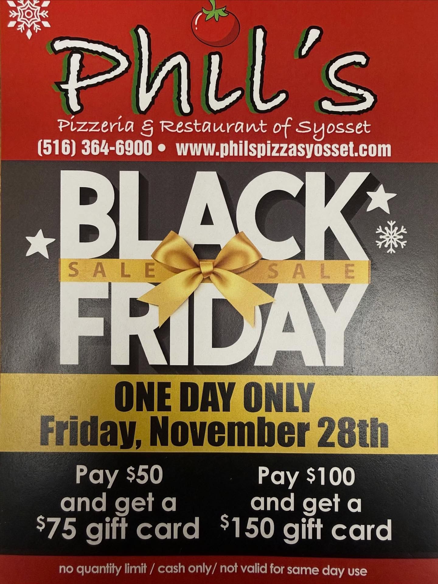 | 🍕 Phil’s Pizzeria – Black Friday Gift Card Bonus 🎁 More pizza, more perks! One day only: Friday, November 28 Pay $50 → Get a $75 gift card Pay $100 → Get a $150 gift card No quantity limit — buy as many as you want! Cash only; not valid for same-day use