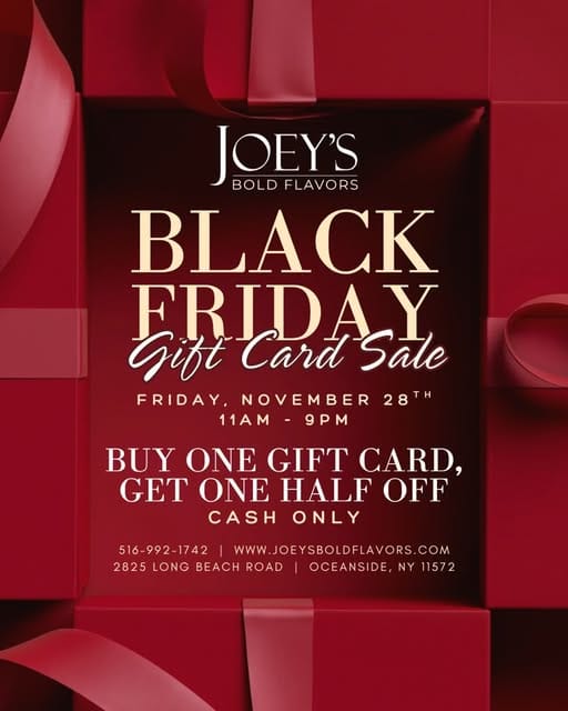 | 🎁 Joey’s Bold Flavors – Black Friday Gift Card Sale🍽️ Treat your loved ones (or yourself)! • Buy one gift card, get one half off • CASH ONLY deal • Happening Friday, November 28 from 11 AM – 9 PM 📍 2825 Long Beach Road, Oceanside, NY 11572 Perfect stocking stuffers or future dinner dates! |