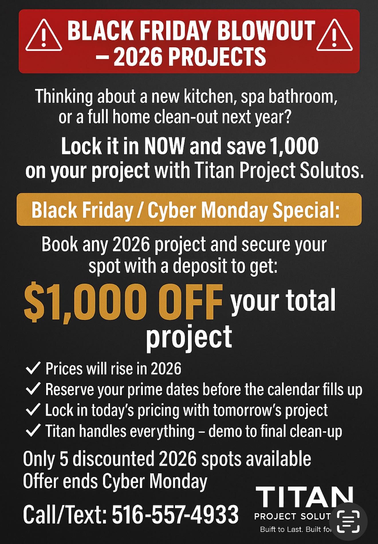 | 🛍️ Titan Project Solutions – Black Friday Home Remodel Deal🛠️ Lock in your 2026 project now and save big.Get $1,000 OFF your total project Book any 2026 remodel with a deposit Includes kitchen, bathroom, or full home renovations Prices locked before 2026 increases Only 5 discounted spots available — offer ends Cyber Monday Licensed, insured, and locally trusted