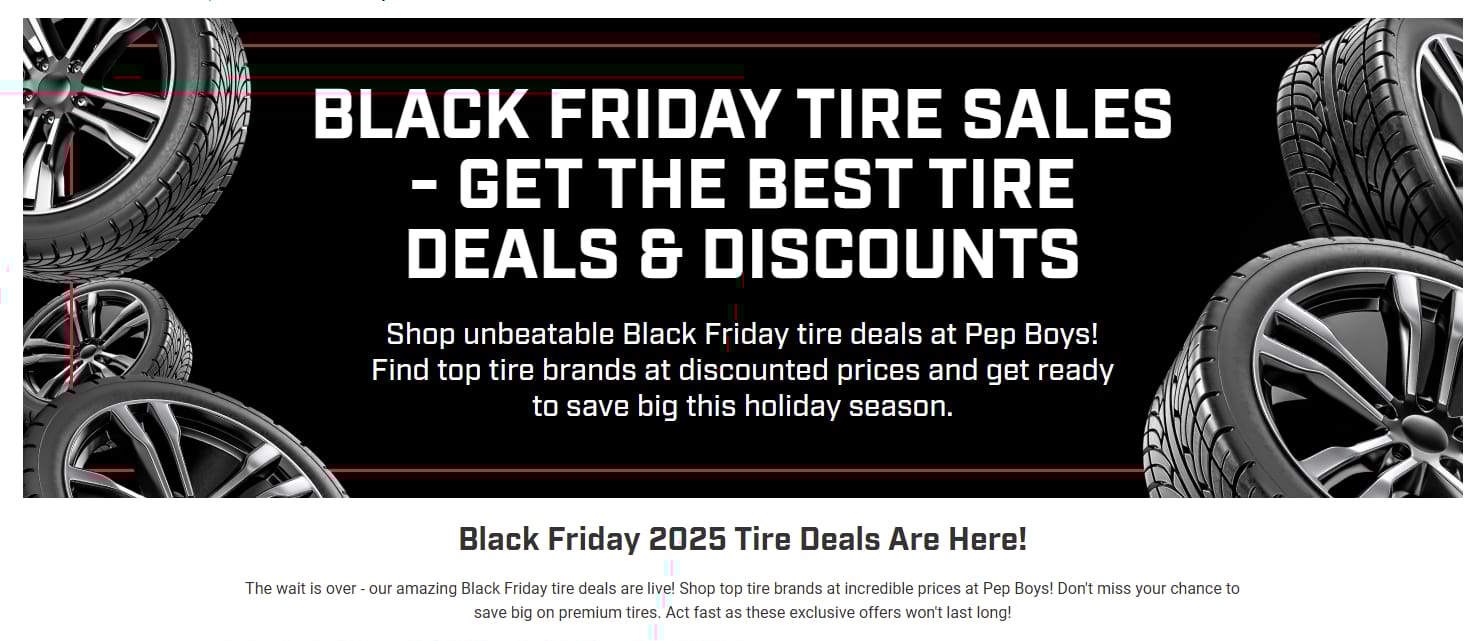 | 🛞 Pep Boys – Black Friday Tire & Auto Service Mega Deals 🚗 More mileage, more savings. Black Friday Tire & Service Deals available Nov 1 – Dec 9 🔥 Buy 2 Cooper Tires, Get 2 FREE (11/19–12/01) 💵 Save up to $600 instantly on a set of Cooper Adventurer All-Season Tires 🛠️ Auto Service Special: Save $100 instantly on $500+ services with coupon (excludes tires) 💳 Get 10% back (up to $100) with Pep Boys Credit Card (11/01–12/01) 🚗 Plus: • Up to $110 back on Continental • Up to $100 back on Pirelli, BFGoodrich, Uniroyal • Up to $80 back on Michelin 🧰 Oil changes, brake service, battery install & more — all discounted for Black Friday 📍 Pep Boys Locations – Nassau County & beyond 📅 Deals end soon – book your appointment now! |