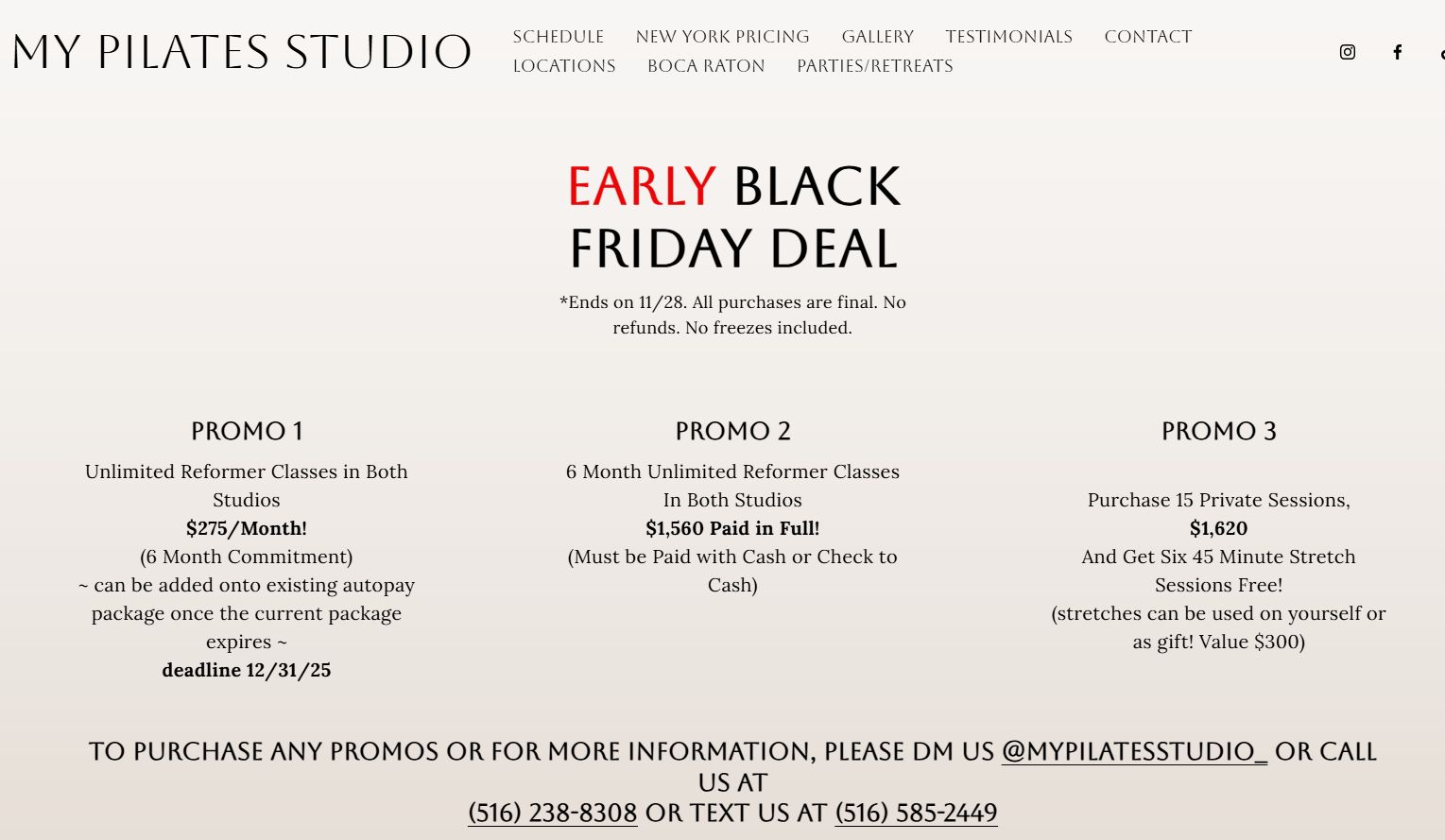 | 🛍️ My Pilates Studio – Early Black Friday Deal🧘♀️ 3 powerful ways to save on reformer classes and private sessions! PROMO 1: Unlimited Reformer Classes – $275/month (6-month commitment) *Can be added to existing autopay packages *Deadline: 12/31/25 PROMO 2: 6 Months Unlimited – $1,560 paid in full (cash or check to cash only) PROMO 3: Buy 15 Private Sessions for $1,620 *Includes 6 free 45-minute stretch sessions (value $300) – use or gift them!