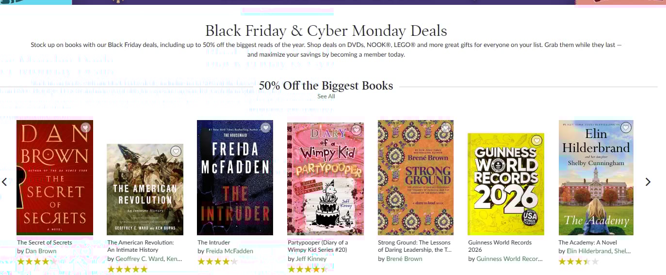 | 🛍️ Barnes & Noble – Black Friday & Cyber Monday Book Deals📚 50% Off the Biggest Reads of the Year Save on bestsellers, kids’ books, and gift picks Up to 50% off top titles like Diary of a Wimpy Kid, Guinness World Records 2026, Dan Brown, and more Deals also apply to DVDs, NOOK®, LEGO® & gift ideas Limited time only – while supplies last Maximize savings by becoming a B&N Member