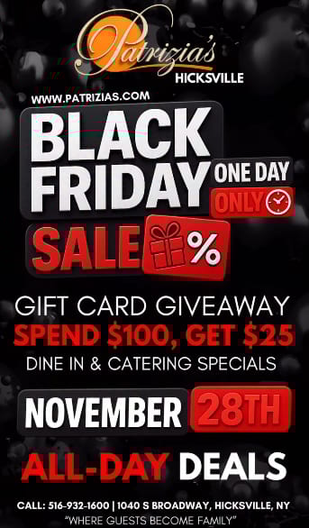 | 🍝 Patrizia’s of Hicksville – Black Friday Gift Card Bonus 2025 🖤 One Day. All Day. One Incredible Offer. Spend $100 on Gift Cards, Get $25 FREE Perfect for gifts, holiday treats, or future visits Exclusive dine-in & catering specials on Nov 28 only Valid only at Patrizia’s Hicksville location
