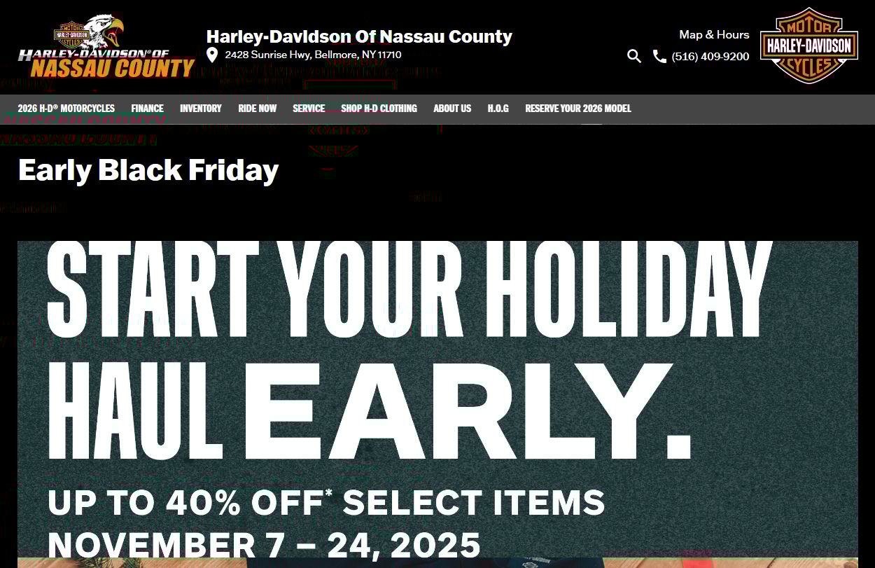 | 🛍️ Harley-Davidson of Nassau County – Early Black Friday Sale🏍️ Gear up for the holidays in style. Save up to 40% off select items Sale runs from November 7–24, 2025 Shop in-store at 2428 Sunrise Hwy, Bellmore, NY Includes clothing, gear & accessories for riders