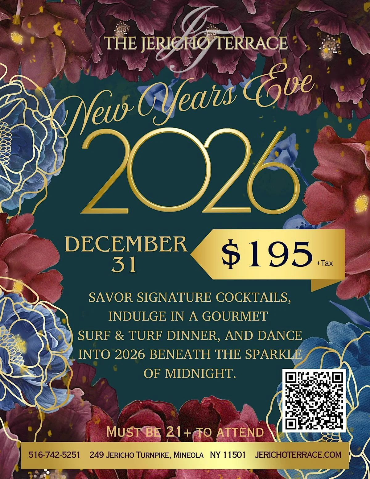 ![]() | New Year’s Eve Gala Ring in 2026 with an elegant evening featuring a gourmet surf-and-turf dinner, cocktail hour stations, top-shelf open bar, and DJ-led dancing through midnight. |