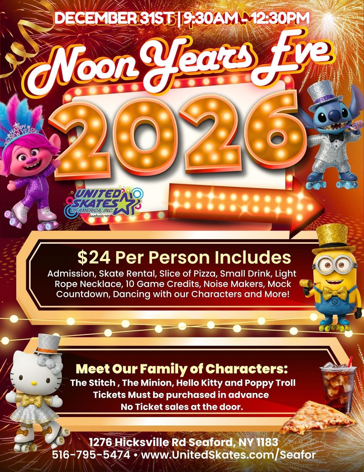 ![]() | Noon Year’s Eve Skate Party Celebrate the new year early with skating, a live DJ, pizza, and a noon countdown, plus visits from kid-favorite characters for a fun family morning. |
