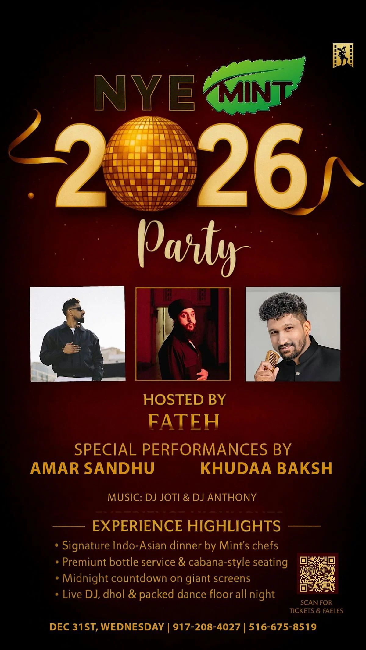 ![]() | Mint NYE 2026 Party High-energy New Year’s Eve celebration with live performances, Indo-Asian dinner, DJs, and a midnight countdown on giant screens. |