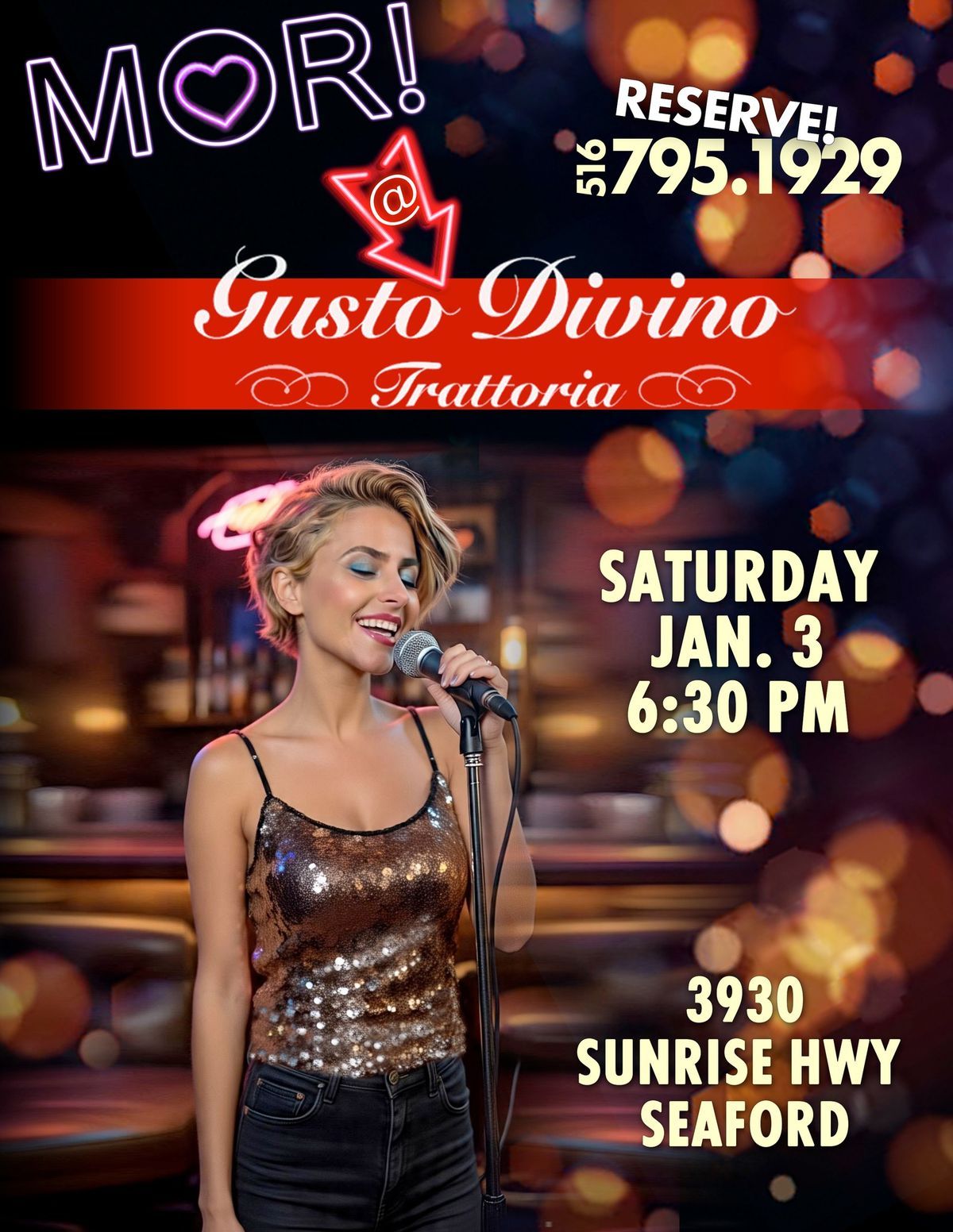 ![]() | Mor @ Gusto Divino Trattoria Enjoy live music with Mor performing crowd-favorite songs across rock, disco, pop, country, and classic hits while you dine and sip cocktails. |