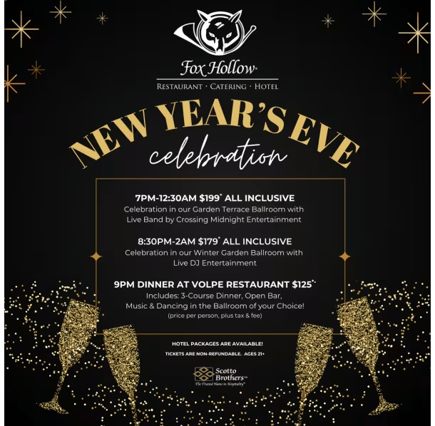 ![]() | New Year’s Eve Celebration Party Ring in 2026 with live music and a DJ all night, plus a full open bar, dinner buffet, and a champagne toast at midnight. |