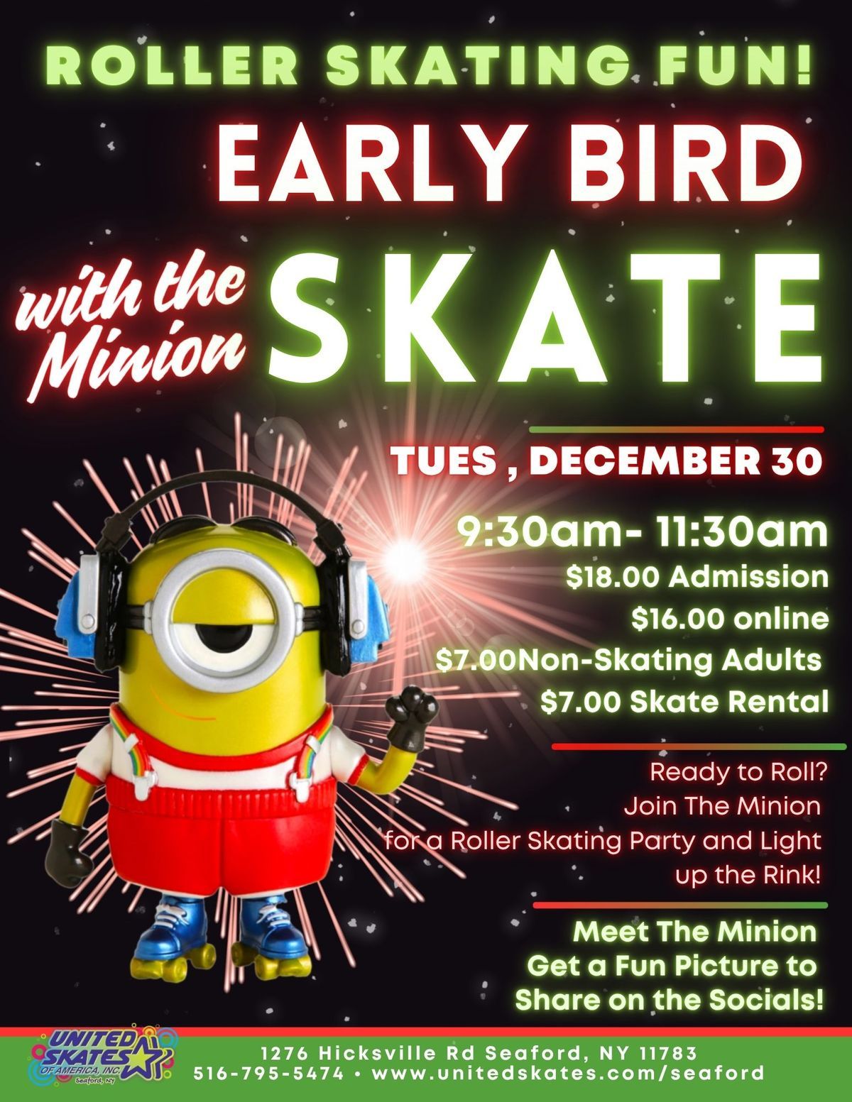 ![]() | Early Bird Skate with the Minion Kick off the morning with a Minion-themed roller skating party featuring music, family fun, photo opportunities, and light-up rink excitement. |