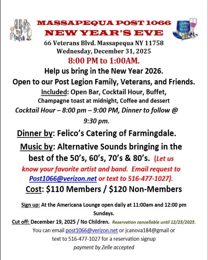 ![]() | Massapequa Post 1066 New Year’s Eve Celebration Celebrate the arrival of 2026 with an open bar, cocktail hour, buffet dinner, champagne toast at midnight, and live music featuring hits from the 50s through the 80s. |