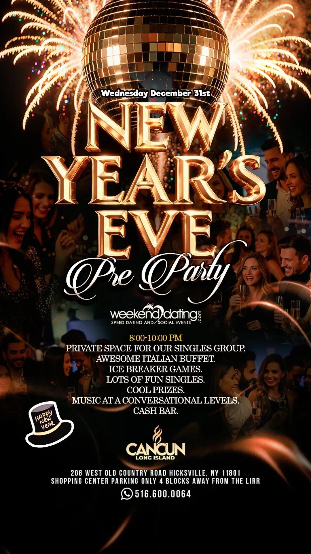![]() | Weekend Dating Pre-NYE Party @ Cancun LI Private singles-only pre-NYE party with Italian buffet, icebreakers, prizes, music, plus access to the midnight after-party. |