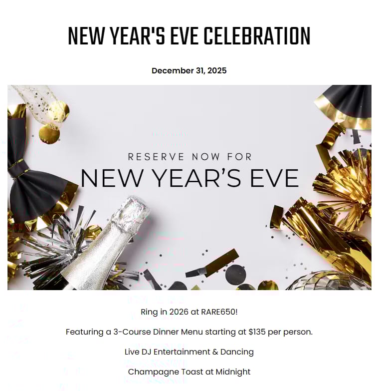 ![]() | New Year’s Eve at Rare650 Celebrate New Year’s Eve with an à la carte dinner, chef’s specials, live DJ entertainment, dancing, and a champagne toast at midnight. |
