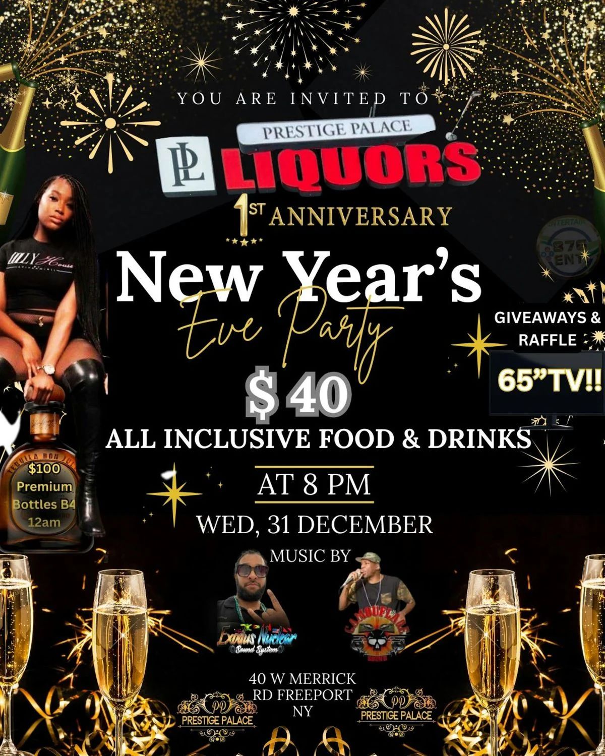 ![]() | Prestige Palace Liquors 1st Anniversary New Year’s Eve Party Celebrate New Year’s Eve with all-inclusive food and drinks, live music, giveaways, raffles, and a high-energy party atmosphere. |