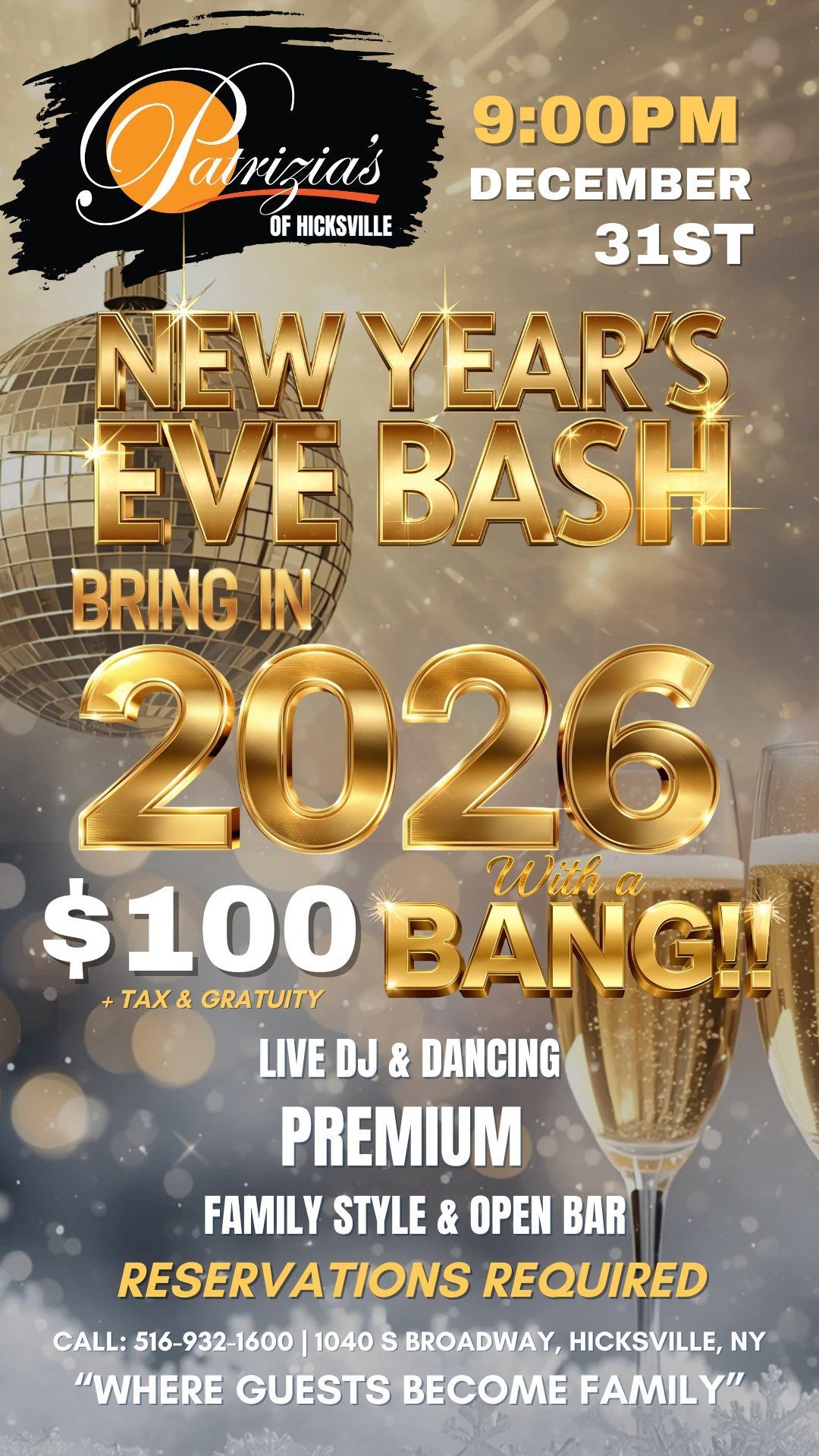 ![]() | New Year’s Eve Bash at Patrizia’s of Hicksville Celebrate the new year with a high-energy party featuring a live DJ, premium family-style Italian dinner, open bar, dancing, and a midnight countdown. |