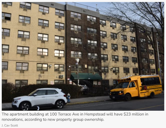 A NYC real estate firm just bought the 420-unit building at 100 Terrace Ave. and plans major renovations. The upgrades will improve living spaces and amenities for residents, giving a nice boost to Hempstead's housing scene.