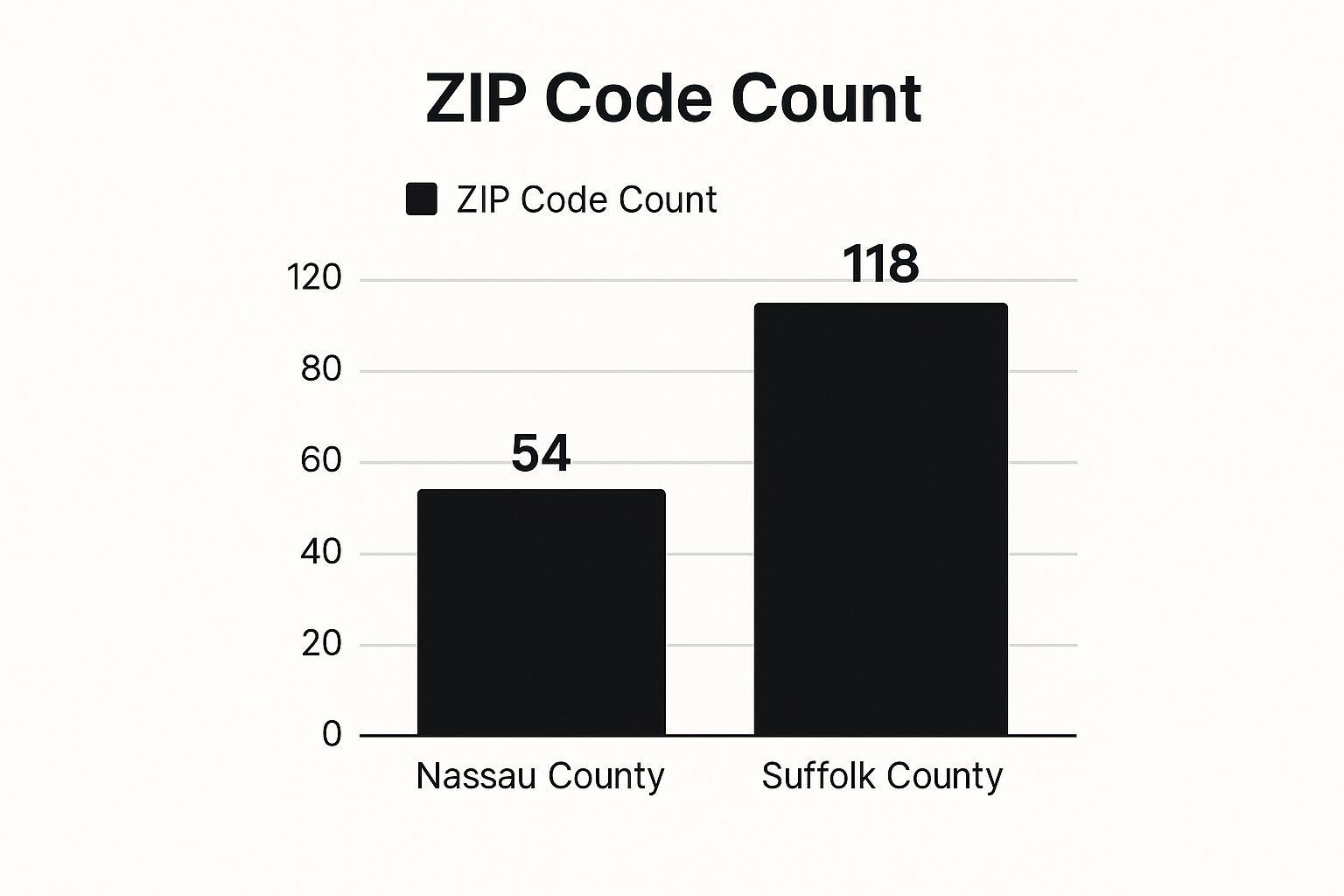Long Island is home to two counties and a combined population of over 7.7 million people as of 2025. The postal codes start with 11001 on the western Nassau border and go all the way up to 11980 at the island's eastern tip. This range covers everything from bustling suburban towns to quiet, rural hamlets. For a deeper dive into how these 119 distinct postal codes are laid out, this guide on Long Island ZIP codes is a great resource.