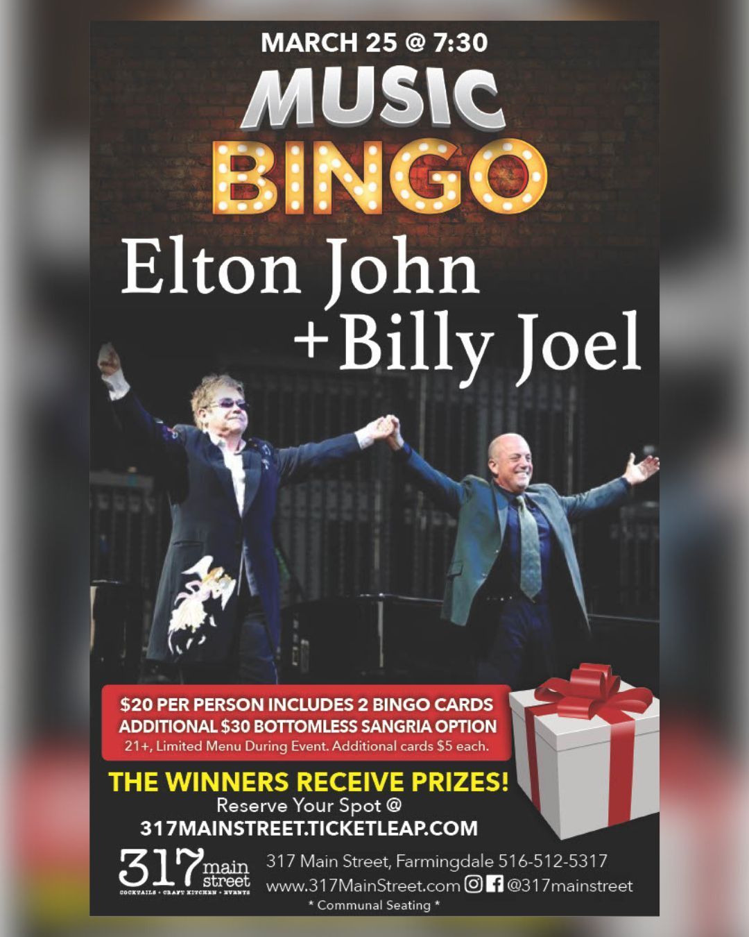 ![]() | Billy Joel & Elton John Music Bingo at 317 Main Street A themed music bingo night with Billy Joel and Elton John songs, prizes, and drinks. |