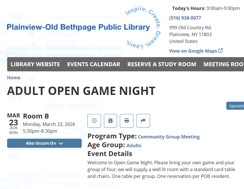 ![]() | Adult Open Game Night Low-pressure game night where the library does the hosting work. |