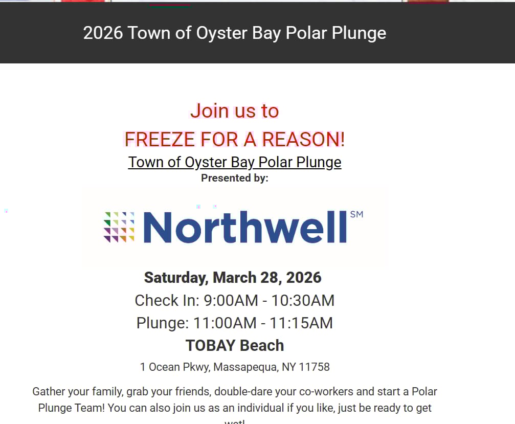 ![]() | 2026 Town of Oyster Bay Polar Plunge A community fundraiser supporting Special Olympics New York with check-in, cheering, and family support. |