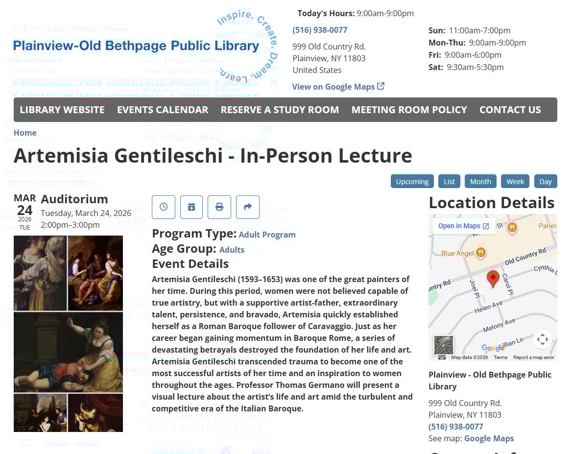 ![]() | Artemisia Gentileschi (In-Person Lecture) Art-history lecture with clear context and zero academic fluff. |