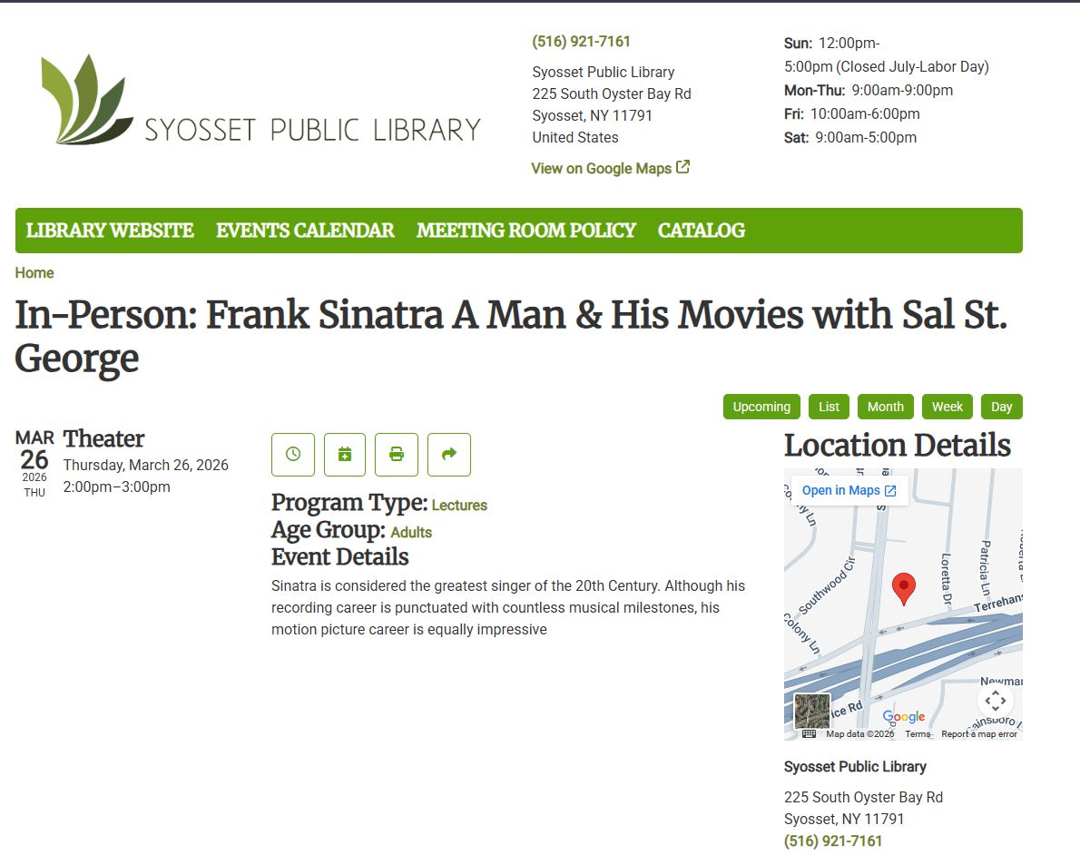 ![]() | Frank Sinatra: A Man and His Movies (Sal St. George) Entertaining talk connecting Sinatra’s music legacy with key film moments. |