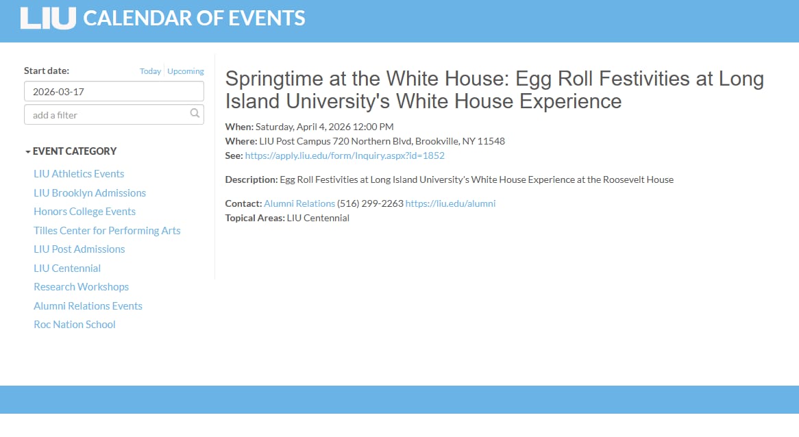 ![]() | Springtime at the White House: Egg Roll Festivities at Long Island University's White House Experience A campus spring celebration inspired by classic White House egg-roll traditions. |