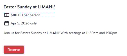 ![]() | Easter Sunday at LIMANI! A refined Easter buffet with seafood, breakfast staples, and celebratory holiday dining. |