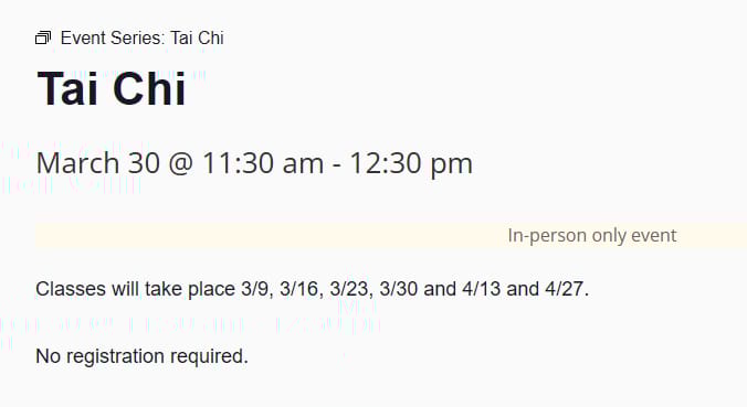 ![]() | Tai Chi A gentle movement class focused on balance, breathing, and flexibility. |