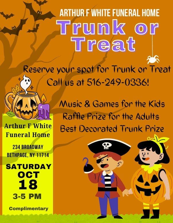 ![]() | 🧸 Kid-Friendly Trunk or Treat Join the Bethpage and Farmingdale communities for a safe and festive Trunk or Treat! Decorate your trunk, bring the candy, and enjoy spooky fun for the whole family. |