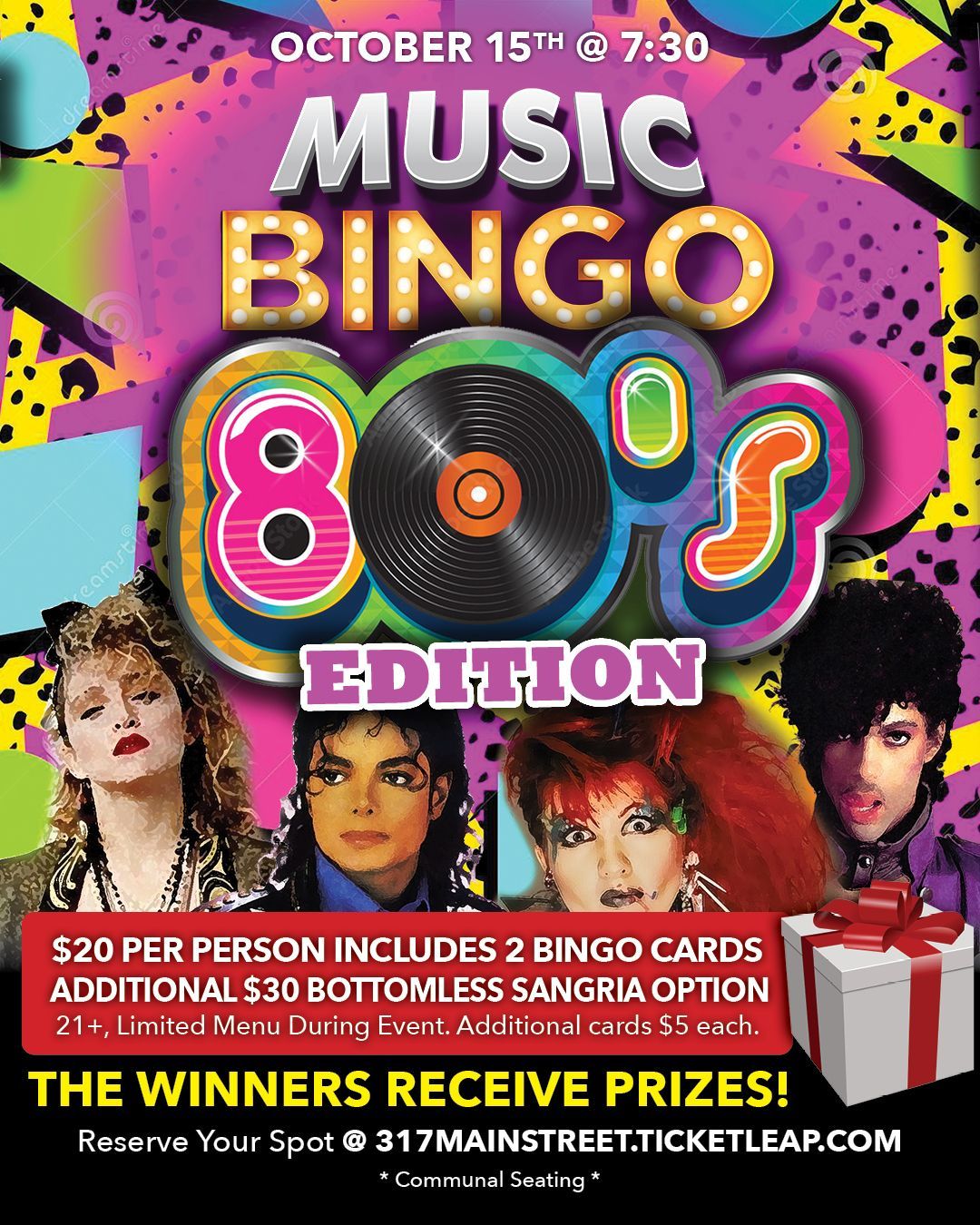 ![]() | 80's Music Bingo at 317 Main Street Relive the 80s while playing music bingo! $20 gets you two cards — plus an optional bottomless sangria add-on. Prizes for all winners! 21+ event. |