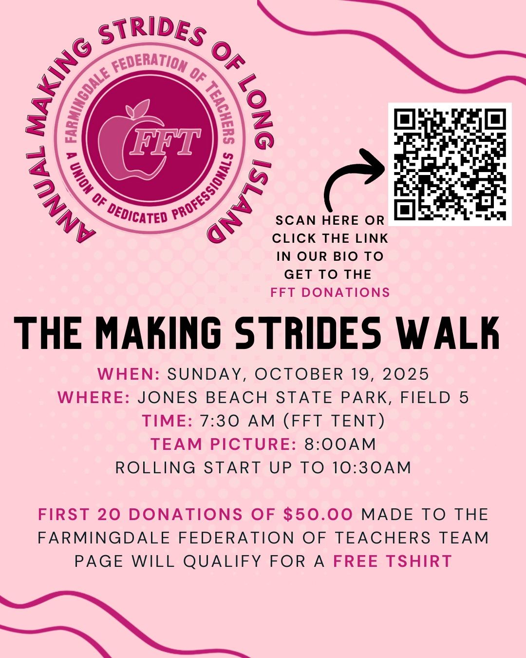 ![]() | Annual Making Strides of Long Island Walk Join the Farmingdale Federation of Teachers and community supporters in the fight against breast cancer at this annual awareness walk along Jones Beach. Participate in team activities, photo ops, and rolling starts—all for a great cause. |