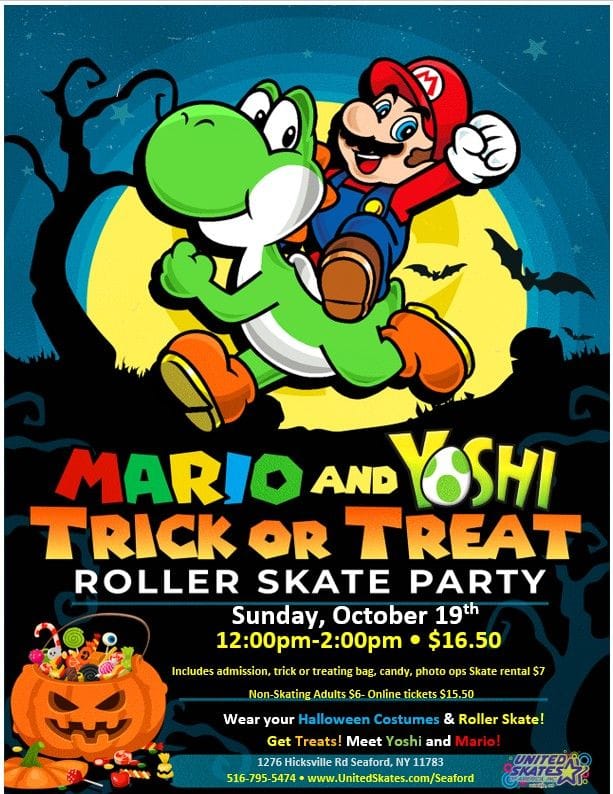 ![]() | 🧸Kid-Friendly Mario & Yoshi Trick or Treat Skate Skate, trick-or-treat, and meet Mario & Yoshi at this family-friendly Halloween roller party. Costumes encouraged for extra fun! |