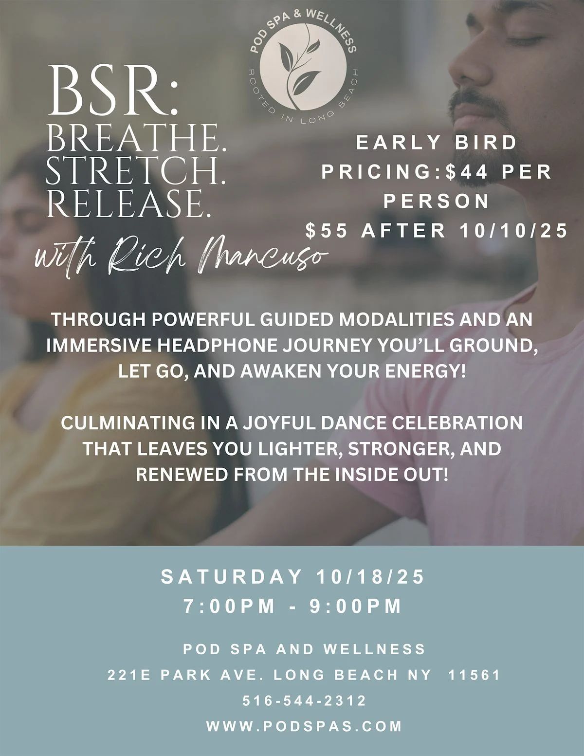 ![]() | BSR: Breathe, Stretch & Release with Rich Mancuso Experience a transformative evening of movement and mindfulness as Rich Mancuso guides you through breathwork, stretching, and energy release, ending with a joyful silent dance party. A full-body reset for both mind and soul. |