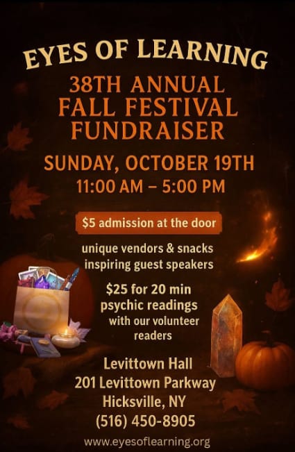 ![]() | Eyes of Learning 38th Annual Fall Festival Fundraiser Enjoy a day of community, shopping, and inspiration with unique vendors, snacks, lectures, and psychic readings. Admission is $5, with proceeds supporting scholarships for Hicksville High School students and local charities. |