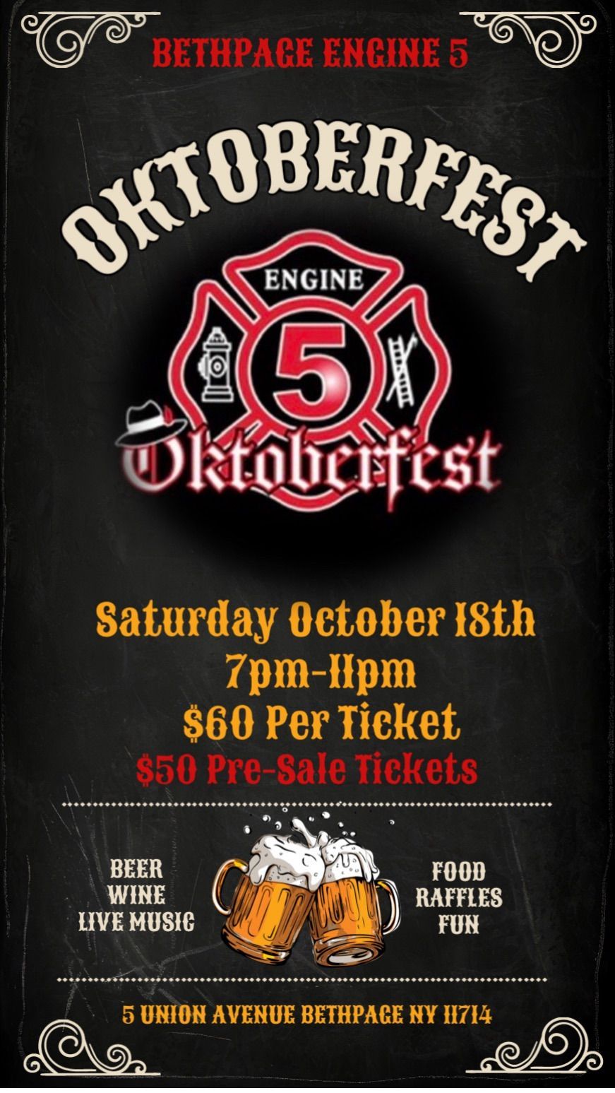 ![]() | Annual Engine 5 Oktoberfest Celebrate Oktoberfest with Engine Company 5! Enjoy a festive evening of food, drinks, music, and community spirit. Pre-sale and door tickets available — all proceeds support the department. |