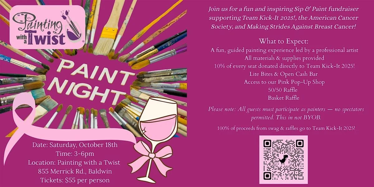 ![]() | Sip & Paint for a Cure – Support the Fight Against Breast Cancer Honor survivors and raise awareness at this guided painting event with lite bites, raffles, a Pink Pop-Up Shop, and more. A creative afternoon supporting breast cancer research and Team Kick-It 2025. |