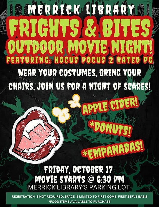 ![]() | 🧸 Kid-Friendly Frights & Bites Outdoor Movie Night Wear your costumes, bring your chairs, and settle in for a spooky outdoor screening of Hocus Pocus 2 (PG). Enjoy seasonal treats like apple cider, donuts, and empanadas available for purchase. First-come, first-served seating. |
