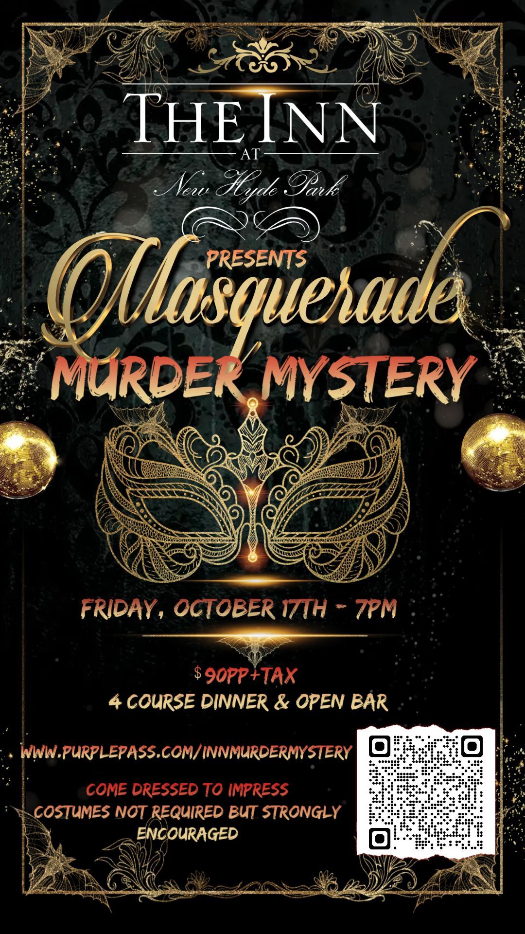 ![]() | Murder at the Inn Enjoy a thrilling Masquerade Murder Mystery with a 4-course dinner and open bar. Costumes are encouraged, but not required, for this unforgettable night of suspense and intrigue. |