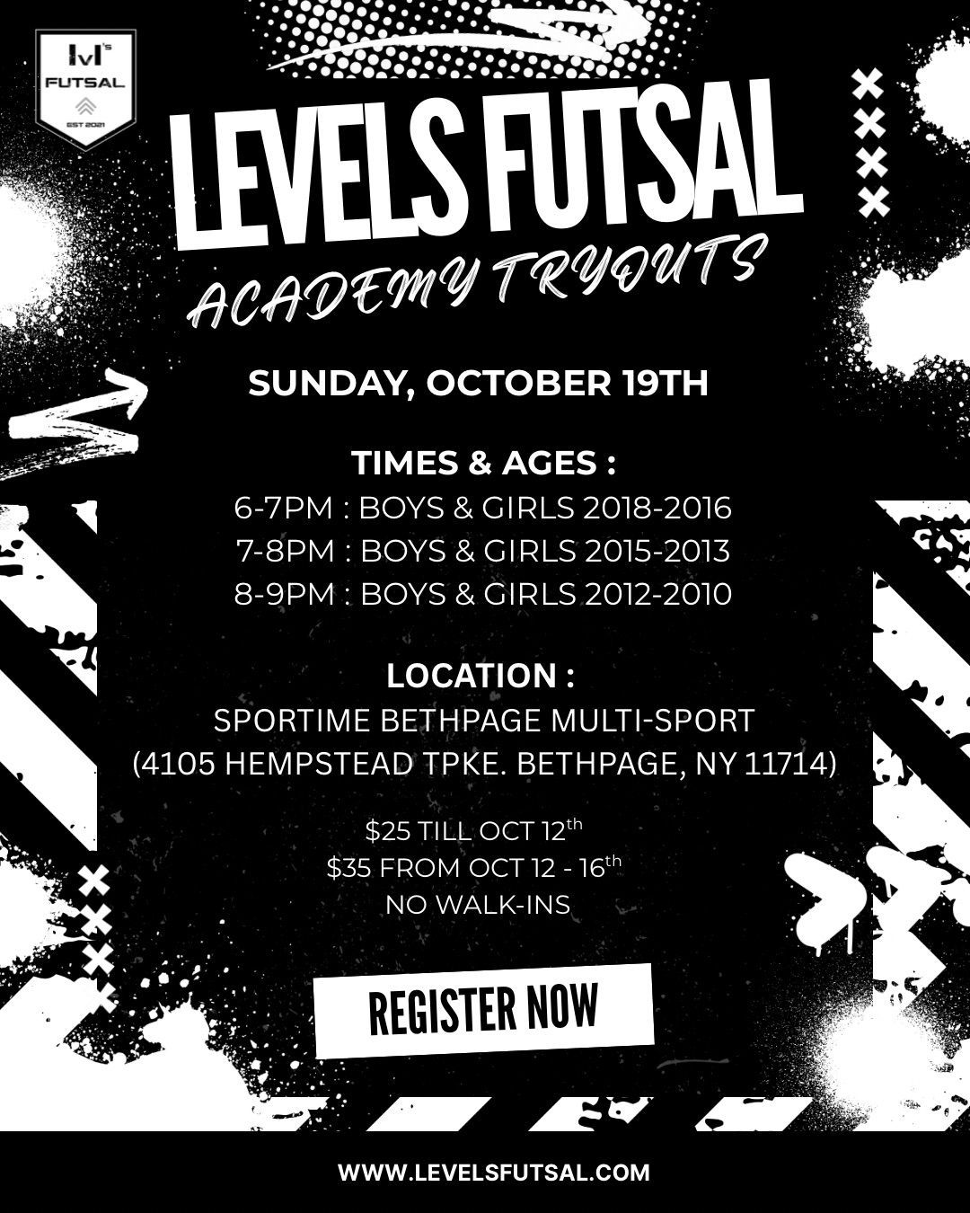 ![]() | 🧸Kid-Friendly Levels Futsal Tryouts Boys and girls born between 2018–2010 are invited to try out for Levels Futsal! Sessions run by age group from 6–9 PM. Register online to secure your spot on the court. |