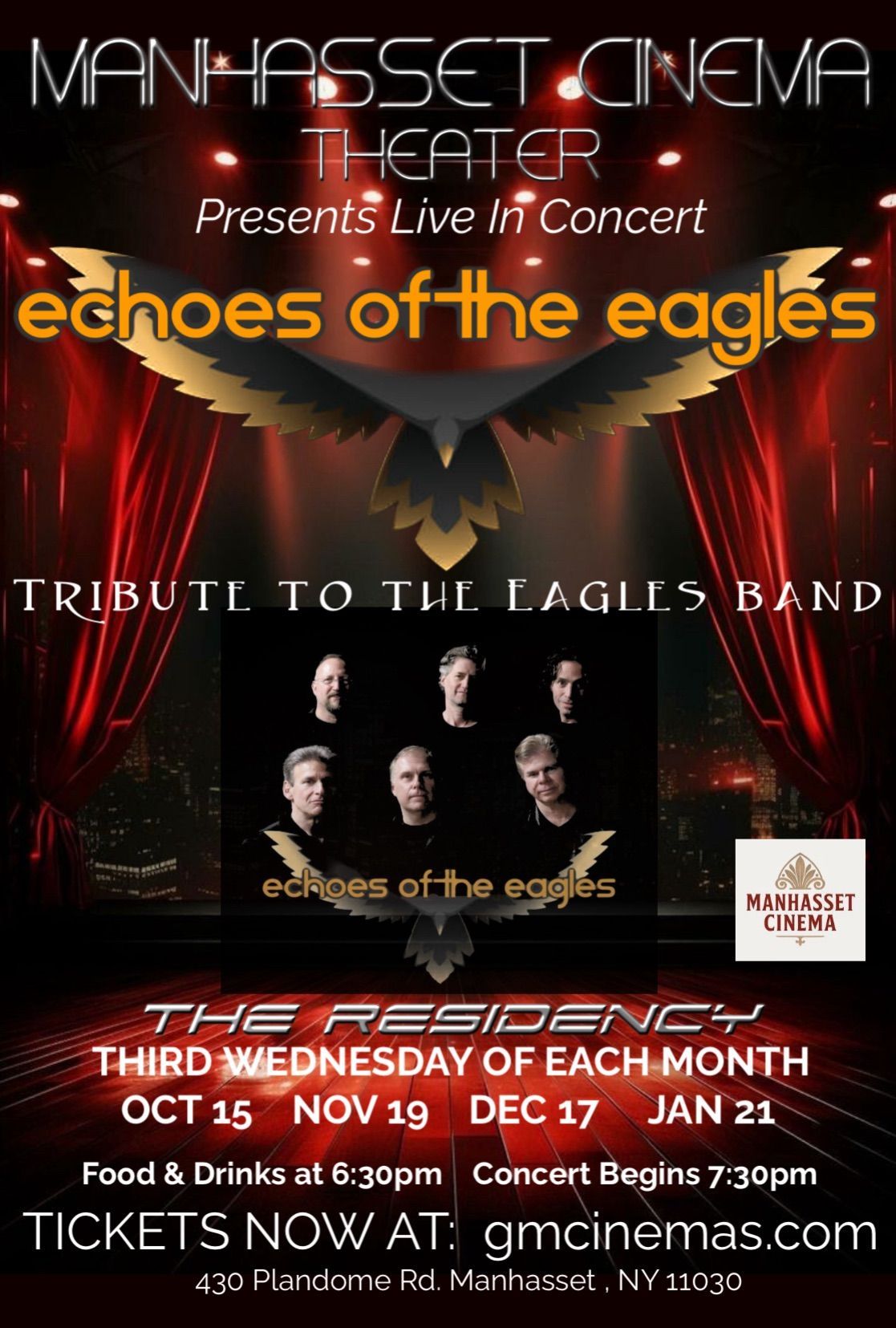 ![]() | Echoes of the Eagles – Tribute to The Eagles Experience the timeless classics of The Eagles performed live by Echoes of the Eagles. This concert is part of the Manhasset Cinema residency series, happening every third Wednesday of the month. Doors open for food & drinks at 6:30 PM. |